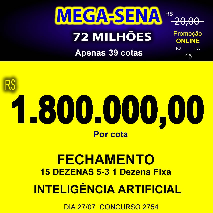 15 dezenas no fechamento, acertando 5 garante mínimo 3 + 1 dezena fixa em todos os bilhetes, 7 jogos de 7 dezenas dividido em 39 cotas