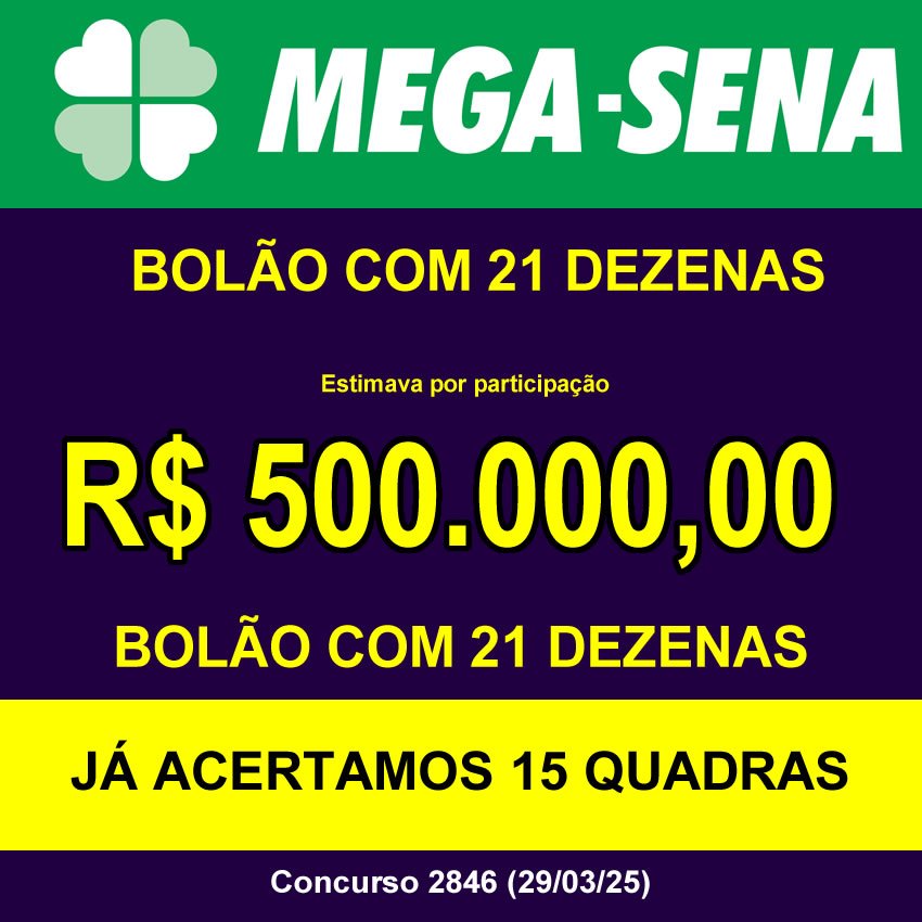 Não fechou a quantidade mínima de participantes adiamos para o concurso Mega-sena 2846 se acumular.